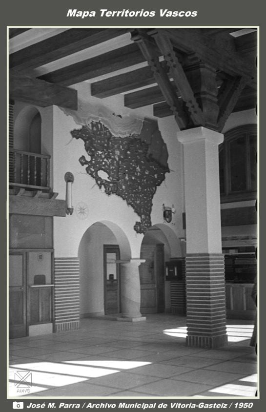 Es curioso observar que en una de las paredes del vestíbulo se colocara, en ese año 1950, un mapa con los siete territorios vascos. Los cuatro del Estado Español con bastantes detalles y los pertenecientes a Francia con sus límites dibujados y el espacio coloreado, sin añadir otros datos. Ello a pesar de la censura que estaba “al loro” de los movimientos de los llamados entonces por el Régimen, “rojos y separatistas”.