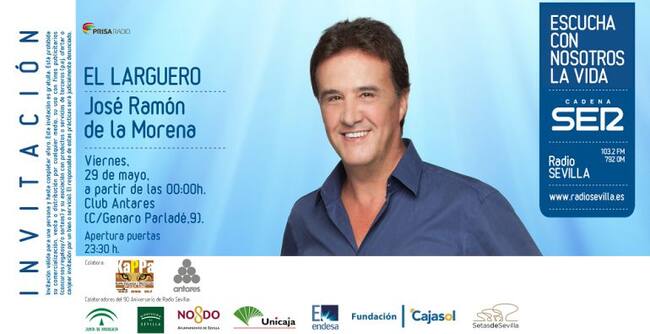 El Club Antares de Sevilla acoge este viernes, 29 de mayo, la emisión del programa El Larguero que dirige y presenta José Ramón de la Morena. Si quieres acompañarnos, descarga tu invitación en el siguiente enlace: https://www.ticketea.com/el-larguero-en-sevilla/