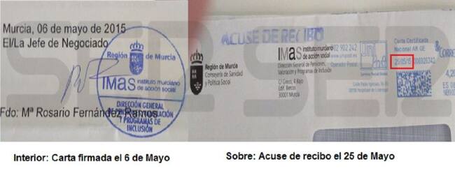 Una familia murciana muestra su malestar porque la carta de rebaja en la prestación por dependencia le llegó el día después de las elecciones, cuando estaba firmada 19 días antes. Sanidad dice que no ha dado orden de retrasar estos envíos "en ningún caso".