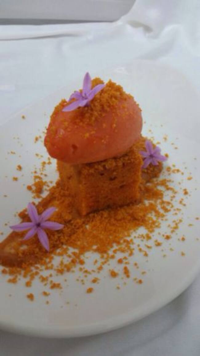El postre con ñora es ya el final de este menú: el  más arriesgado, sin duda. Mousse de ñora  caramelizada, con bizcocho de ñora asada.