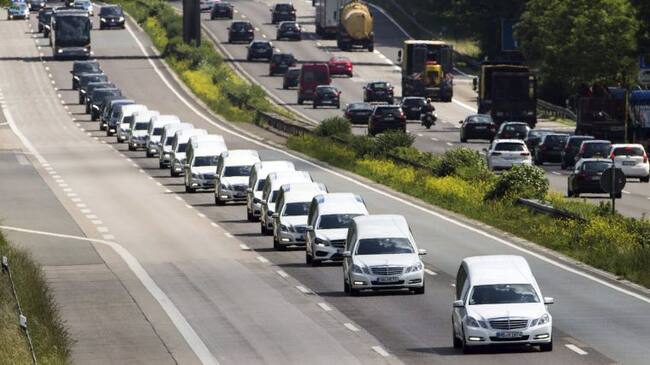 KOE111 MÜLHEIM (ALEMANIA), 10/06/2015.- Un convoy de coches fúnebres escoltado por la policía se dirige a Halten am See, en una carretera cercada a la localidad de Mülheim, Alemania, hoy, miércoles 10 de junio de 2015. Los cuerpos de 30 de las víctimas del avión de Germanwings que se estrelló el pasado marzo en los Alpes franceses han llegado esta noche desde Francia a Düsseldorf en un vuelo especial de Lufthansa, que repatriará a la mayoría de los 16 alumnos del instituto de secundaria de Haltern am See. El copiloto del avión siniestrado, Andreas Lubitz, estrelló deliberadamente el avión, que cubría la ruta Barcelona-Düsseldorf, con otras 149 personas a bordo, según los resultados de la investigación. EFE/Rolf Vennenbernd / ROLF VENNENBERND (EFE)
