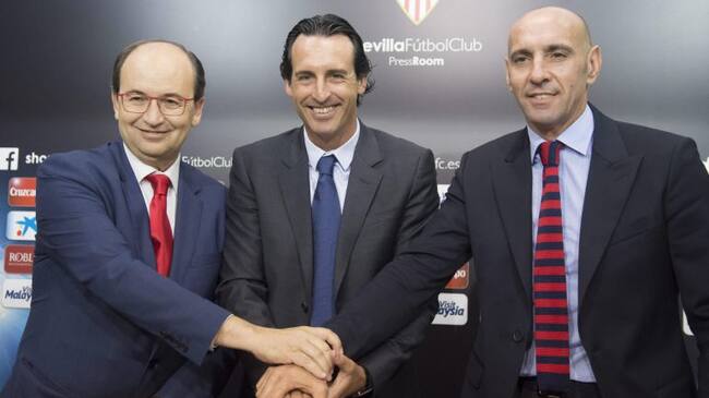 GRA309 SEVILLA, 12/06/2015.- El presidente del Sevilla F.C, José Castro (i), junto al director deportivo, Ramón Rodriguez "Monchi" (d), estrechan las manos con el entrenador Unay Emery, tras la ampliación de su contrato hasta junio de 2017 con el club de Nervión. EFE/Raúl Caro / RAUL CARO (EFE)