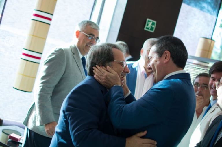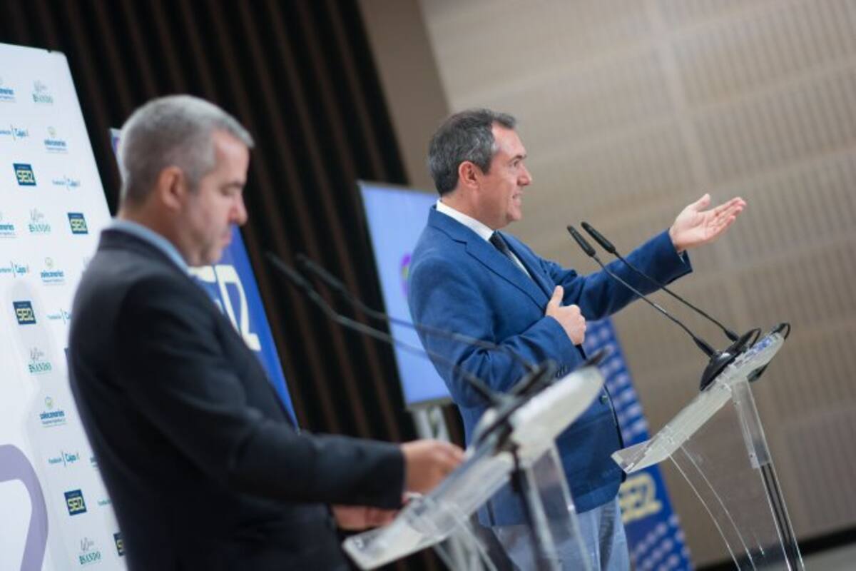 Juan Espadas, alcalde de Sevilla recibe una reproducción de la reja de entrada a Radio Sevilla, de la manos de Antonio Morales, director de SoloCanarias