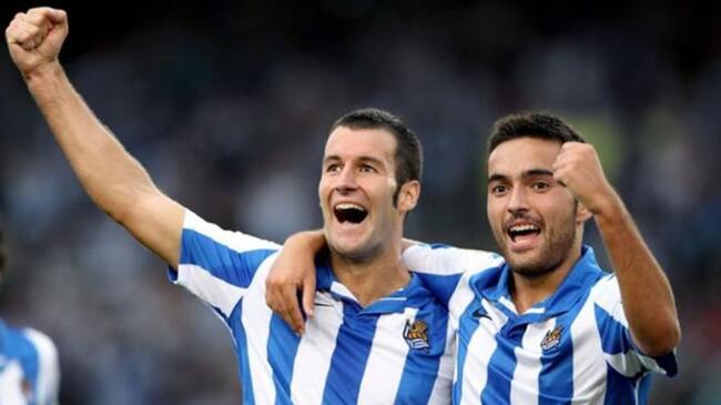 Dani Estrada, a la derecha, celebra un gol con Agirretxe durante su etapa en la Real Sociedad / EFE