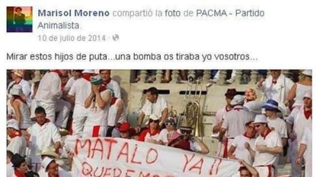 La concejala de protección animal también en noviembre de 2014 hizo un comentario al compartir una foto de PACMA-Partido Animalista donde se ve a unos espectadores de acto taurino con un cartel de "Mátalo ya". La edil añadía el siguiente texto: "Mirad estos hijos de puta... una bomba os tiraba yo a vosotros..."