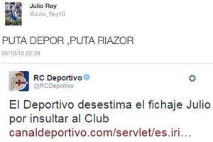 Julio Rey, jugador del Deportivo Arousa, havia tancat el seu fitxatge pel Deportivo de la Corunya, però un tuit ofensiu que va escriure el 2012 ha acabat frustrant la seva incorporació al quadre gallec.