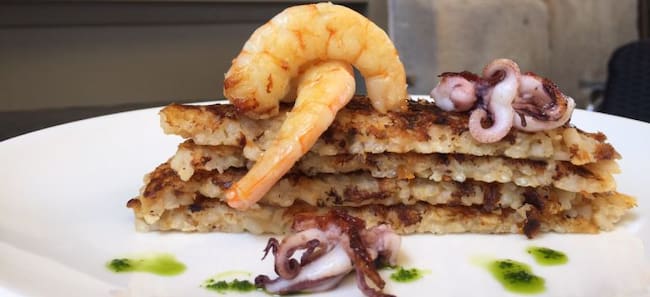 Paul Ibarra, del Restaurante Los Fueros, reinventa la paella a base de txipiron y langostino