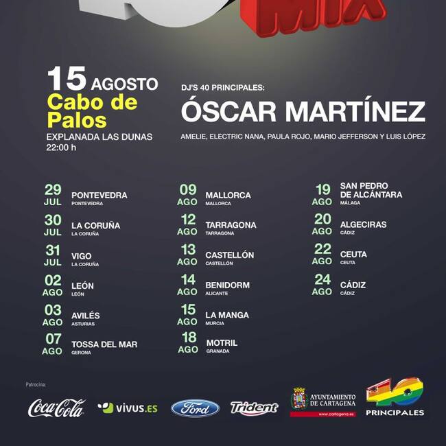Los 40 Principales vuelven a ser protagonistas de la diversión en el verano en la Región de Murcia y traen a Cabo de Palos su gira "40 Hot Mix Road Show", una gran fiesta con actuaciones musicales de los artistas que suenan en la radio y actuaciones de disc-jockeys de la cadena.