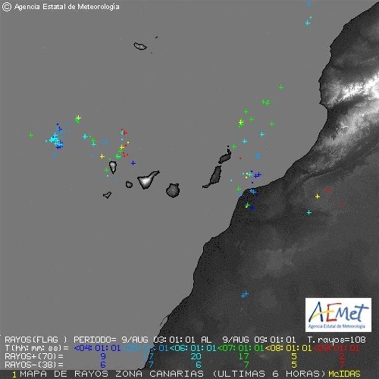 Las tormentas que todavía están afectando al archipiélago canario han venido acompañadas de abundante aparato eléctrico que han dejado un total de 108 rayos entre las 03.00 y 09.00 horas, según datos de la Agencia Estatal de Meteorología (Aemet).