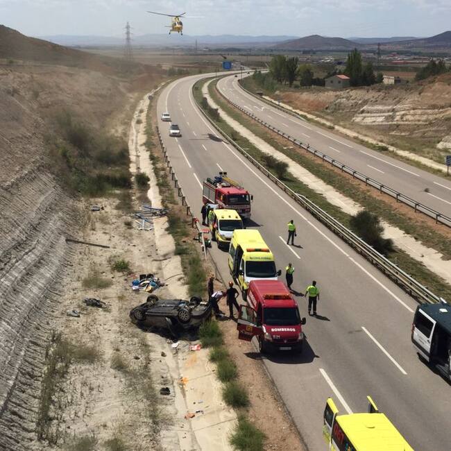 En el caso de los afectados por el percance de la provincia de Teruel, se salieron de la vía por causas desconocidas y dieron varias vueltas de campana en torno a la una y media de la tarde. Los cinco pertenecen a una misma familia, un matrimonio con sus dos hijos, y el abuelo de los pequeños. Precisamente este último es el que reviste más gravedad por politraumatismos y por ello tuvieron que operarlo en el Hospital Miguel Servet de Zaragoza.