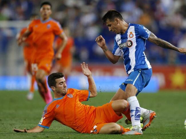 GRA655. CORNELLA-EL PRAT (BARCELONA), 22/09/2015.- El defensa del Valencia CF José Luis Gayà (i) disputa un balón con el delantero paraguayo del Espanyol Hernán Pérez (d), durante el partido de la quinta jornada de Liga en Primera División que se juega esta tarde en el Power8 Stadium, en Cornellá-El Prat. EFE/Alejandro García / Alejandro García (EFE)