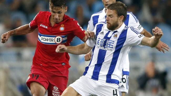 GRA683. SAN SEBASTIÁN, 19/09/2015.- El centrocampista de la Real Sociedad Asier Illarramendi (d) lucha un balón con el paraguayo Hernán Pérez, del RCD Espanyol, durante el encuentro de la cuarta jornada de Liga en Primera División que se disputa hoy en el estadio de Anoeta, en San Sebastián. EFE/Javier Etxezarreta. / Javier Etxezarreta (EFE)