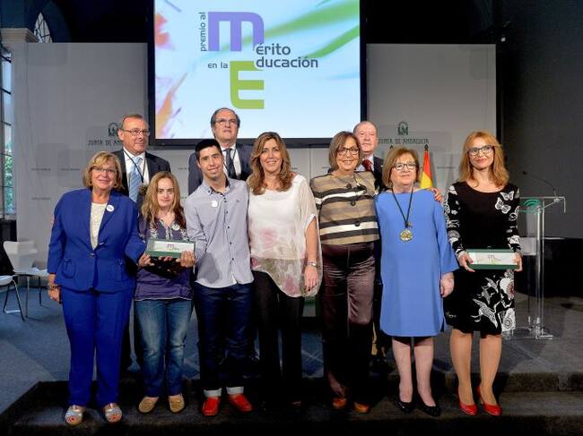 La presidenta de la Junta, Susana Diaz, ha entregado en San Telmo los Premios al Mérito en la Educación 2014. En esta edición han sido reconocidos con la Medalla de Oro el catedrático de Metafísica y ex ministro de Educación Ángel Gabilondo, Alcántara Garrido profesor de Secundaria en Jerez de la Frontera y Maria Carmen Ruiz Hidalgo, inspectora de Educación en Málaga.