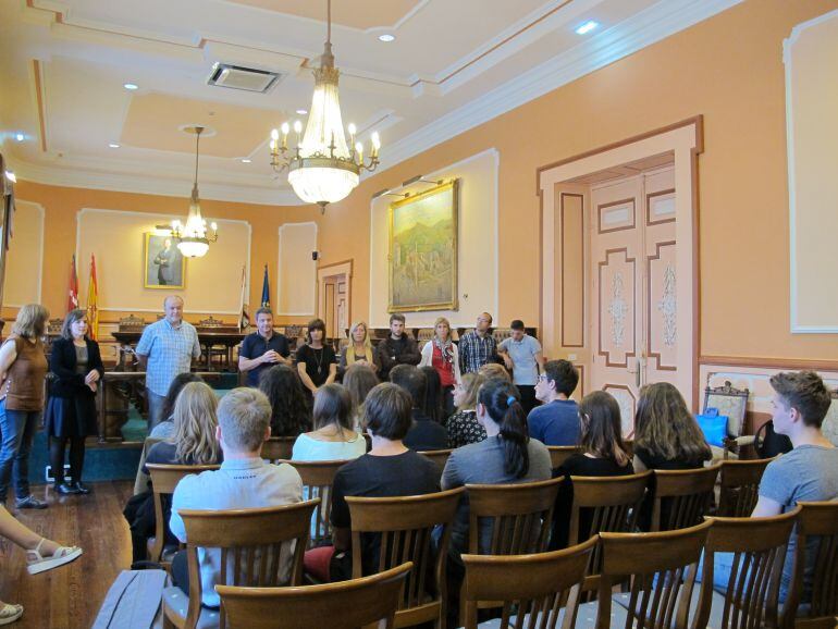 El alcalde de Irun, José Antonio Santano, junto con la delegada de Educación, Josune Gómez, y otros miembros de la corporación municipal, han recibido en el Ayuntamiento de Irun a un grupo de alumnos alemanes de la localidad de Gifhorn, que han venido acompañados por estudiantes iruneses, dentro del programa de intercambio del centro Irungo La Salle.