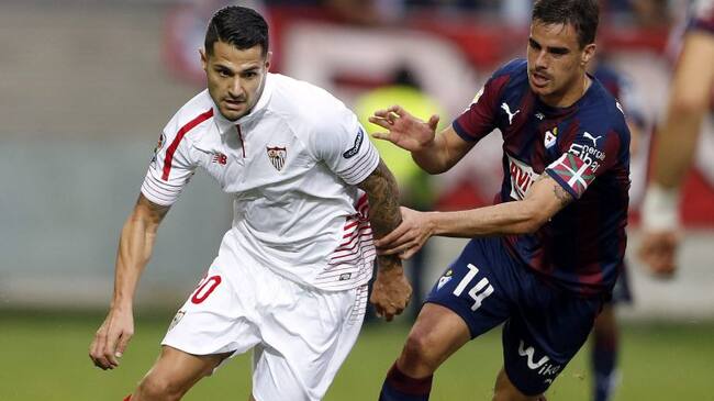 GRA252. EIBAR (GIPUZKOA), 17/10/2015.- El centrocampista del Eibar Dani García (d) y el centrocampista del Sevilla Víctor Machín, durante el partido de la octava jornada de Liga que disputan en el estadio de Ipurua de la localidad guipuzcoana de Eibar. EFE/Javier Etxezarreta. / Javier Etxezarreta (EFE)