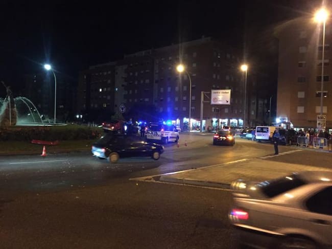 Foto del accidente de anoche en la rotonda junto a la Tejera. Aunque la imagen no es del todo nítida, encima de la rotonda se puede ver el coche que fue apartado de la vía para no interferir el tráfico en la zona. / Radio Palencia.