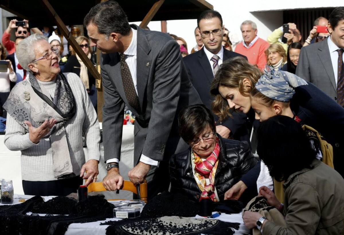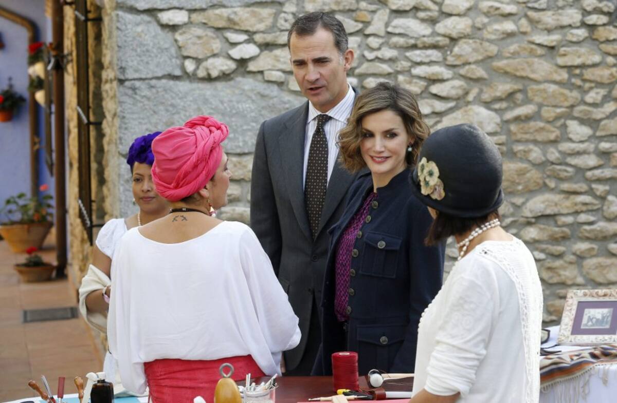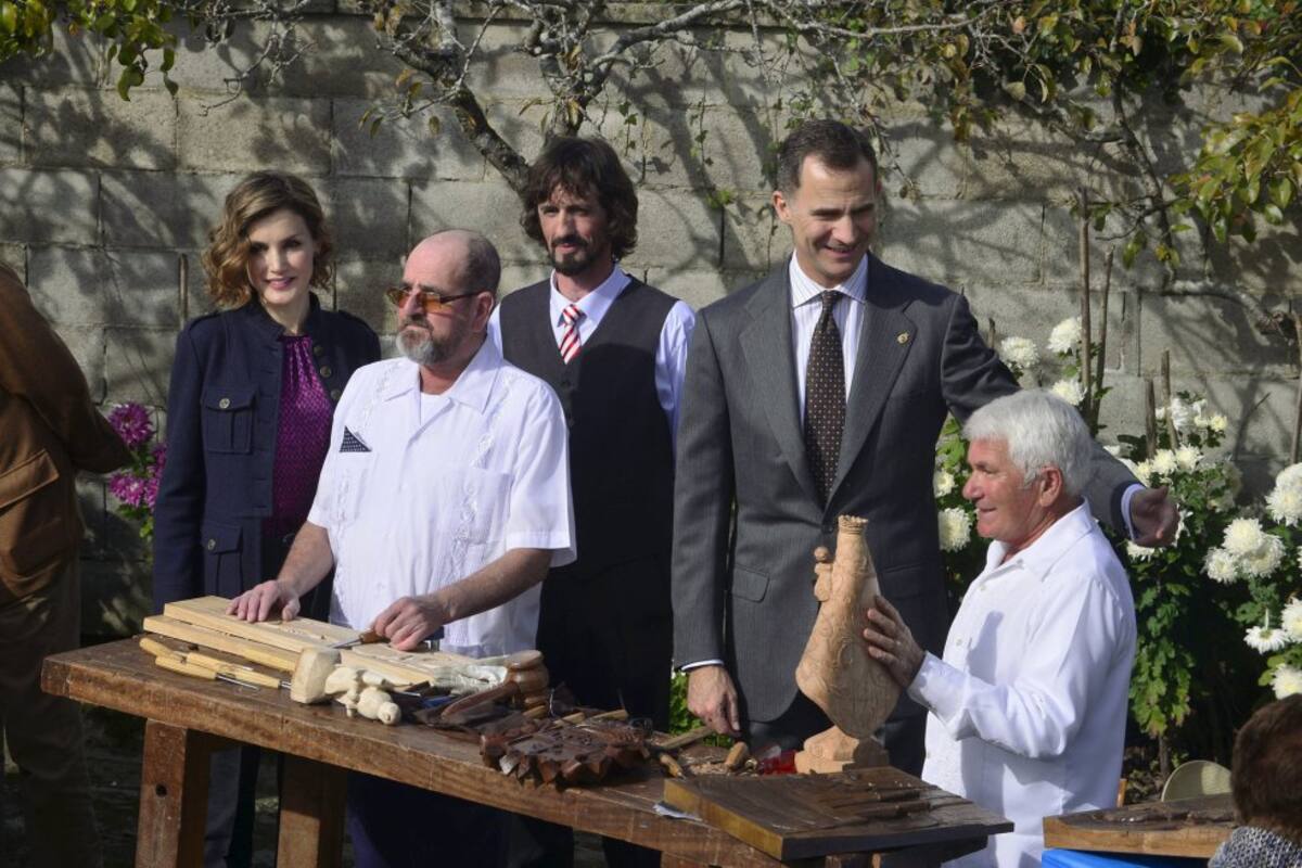 Spain's King Felipe (2nd R) and Queen Letizia (L) talk to woodworkers during a visit to Colombres in Asturias, northern Spain, October 24, 2015. The town received a Princess of Asturias award for Exemplary Town of Asturias. The awards are held annually since 1981 to reward scientific, technical, cultural, social and humanitarian work done by individuals, work teams and institutions. REUTERS/Vincent West