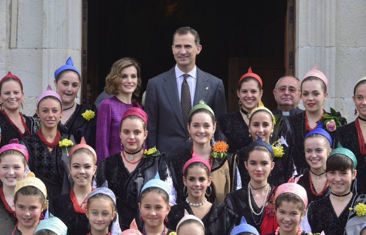 Spain's King Felipe (L) and Queen Letizia pose with girls in regional costume during a visit to Colombres in Asturias, northern Spain, October 24, 2015. The town received a Princess of Asturias award for Exemplary Town of Asturias. The awards are held annually since 1981 to reward scientific, technical, cultural, social and humanitarian work done by individuals, work teams and institutions. REUTERS/Vincent West