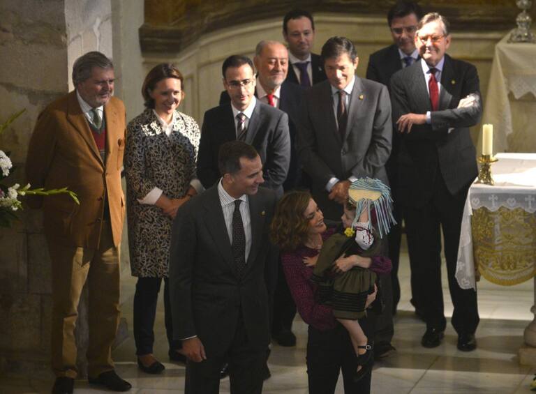 ATTENTION EDITORS: SPANISH LAW REQUIRES THAT THE FACES OF MINORS ARE MASKED IN PUBLICATIONS WITHIN SPAIN. Spain's King Felipe (front L) looks on as Queen Letizia holds a girl wearing traditional costume during a visit to Colombres in Asturias, northern Spain, October 24, 2015. The town received a Princess of Asturias award for Exemplary Town of Asturias. The awards are held annually since 1981 to reward scientific, technical, cultural, social and humanitarian work done by individuals, work teams and institutions. REUTERS/Vincent West