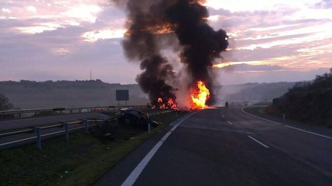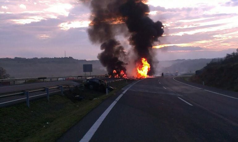 La autovía ha permanecido cortada al tráfico como consecuencia del accidente y de los trabajos de extinción del fuego y retirada de los vehículos implicados.