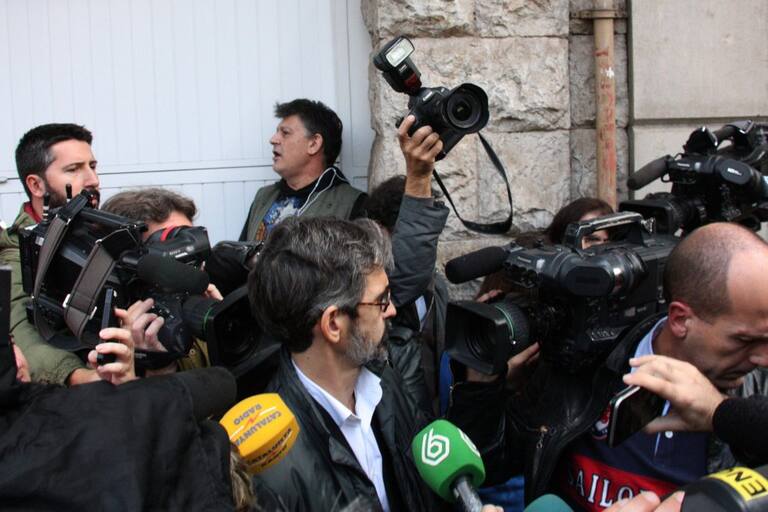 L'advocat de la família Pujol, Cristobal Martell, sortint del domicili de l'expresident de la Generalitat, envoltat de periodistes.
