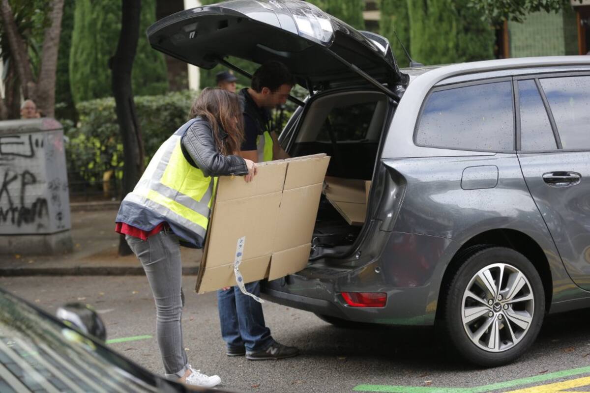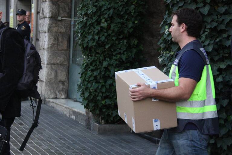 Un agent de la Policia Naional treu una capsa amb documentació requisada al domicili de l'expresident de la Generalitat Jordi Pujol.