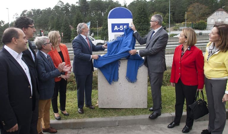 GRA233. MOS (PONTEVEDRA), 26/10/2015.- El secretario de Estado de Infraestructuras, Transportes y Vivienda, Julio Gómez-Pomar (5i), y el delegado del Gobierno en Galicia, Santiago Villanueva (3d), descubren el hito kilométrico en el acto de inicio de las obras de mejora de la seguridad vial en el tramo de la Autovía A-55 entre Porriño y Vigo. EFE/Salvador Sas