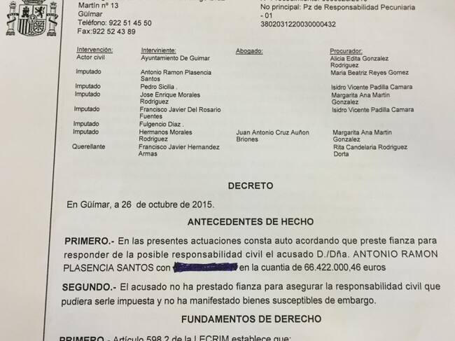 Decreto del Juzgado número 2 de Güimar por la que se embarga los bienes de Antonio Plasencia por 66 millones de euros. / CADENA SER