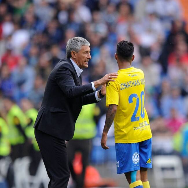 MADRID, SPAIN - OCTOBER 31: Head coach Quique Setien of UD Las Palmas chats with Jonathan Viera during the La Liga match between Real Madrid CF and UD Las Palmas at Estadio Santiago Bernabeu on October 31, 2015 in Madrid, Spain. (Photo by Denis Doyle/Getty Images) / Denis Doyle (Getty Images)