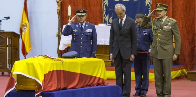 Spain's Defence Minister Pedro Morenes pays his last respects during the funeral of three soldiers at Gando military base in the Canary island of Gran Canaria, Spain, November 1, 2015. The three soldiers died after the Spanish military helicopter they were travelling aboard crashed last week south of the Canary Islands. REUTERS/ Borja Suarez / BORJA SUAREZ (Reuters)