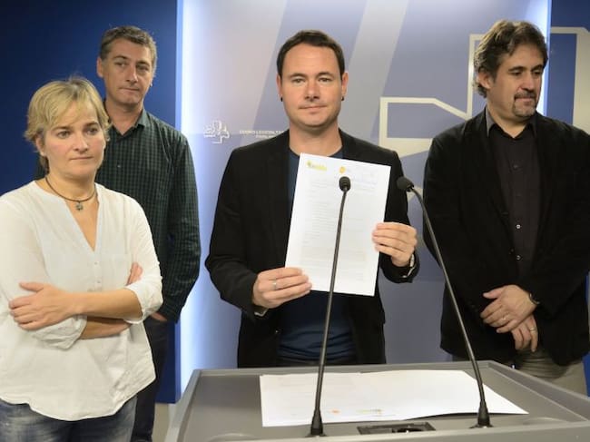 Hasier Arraiz (mostrando la proposicion registrada), acompañado de Urizar, Ubera y Matute / JOSE RAMON GOMEZ (EFE)