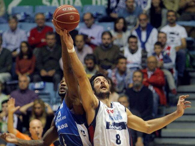 GRA388. SANTIAGO DE COMPOSTELA, 07/11/2015.- El pivot del Rio Natura Juanjo Triguero (d) y el pivot estadounidense del Retabet.es GBC Landon Milbourne durante el salto inicial del partido de la quinta jornada de la liga ACB que se disputa en el Multiusos de Sar de Santiago de Compostela. EFE/ Xoán Rey. / XOÁN REY. (EFE)