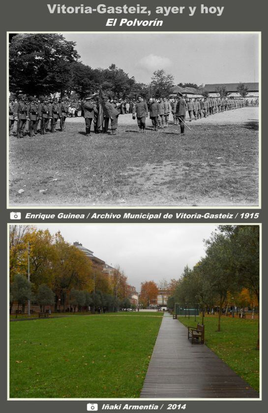 En las fotos que se muestran seguidamente vemos el detalle de esa jura de bandera entonces y el aspecto actual del parque. Al fondo, en la foto antigua, se observan los pabellones que fueron polvorín militar.