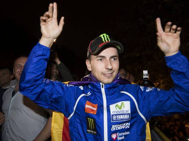 GRA519. PALMA DE MALLORCA, 12/11/2015.- El piloto Jorge Lorenzo saluda desde el autobus descapotable en el que ha recorrido las calles de Palma de Mallorca, a los aficionados que han asistido esta noche a la celebración del campeonato del mundo de Moto GP, conseguido el pasado Domingo en el circuito de Cheste. EFE / Cati Cladera. / Cati Cladera (EFE)