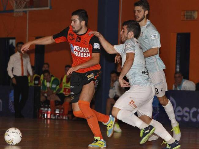 Chino se defiende de dos jugadores del Santiago Futsal / Burela FS