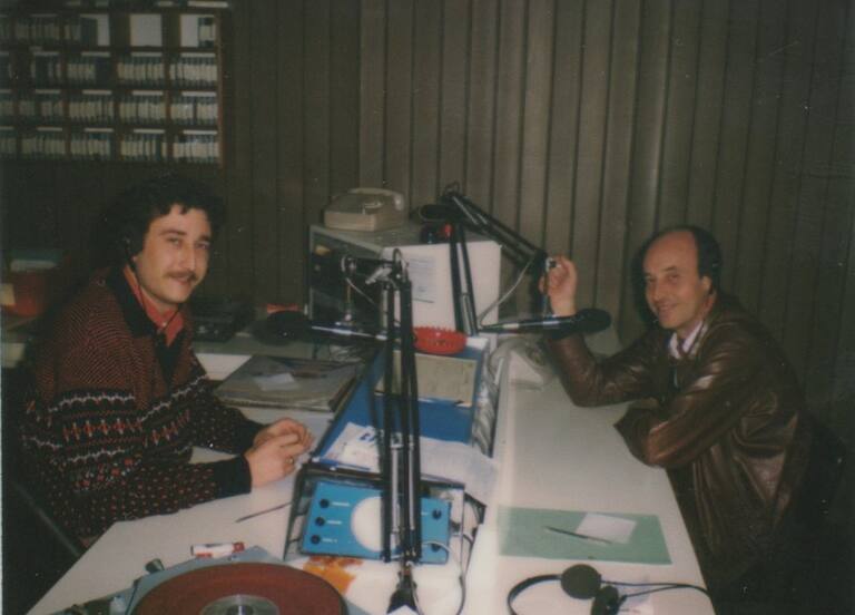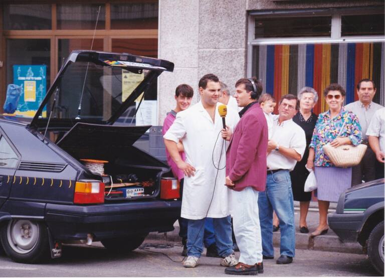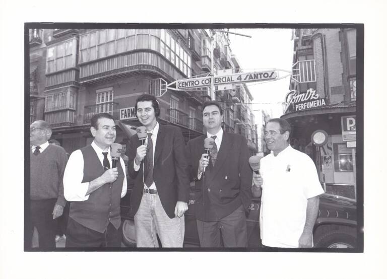 • La radio en la calle entrevistando a comerciantes de los barrios .En la foto, un joven Miguel Meroño.