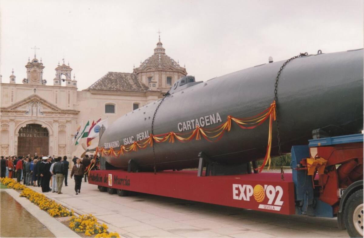 • LLegada del submarino Peral de Cartagena a los pabellones de la Expo 92 de Sevilla.
