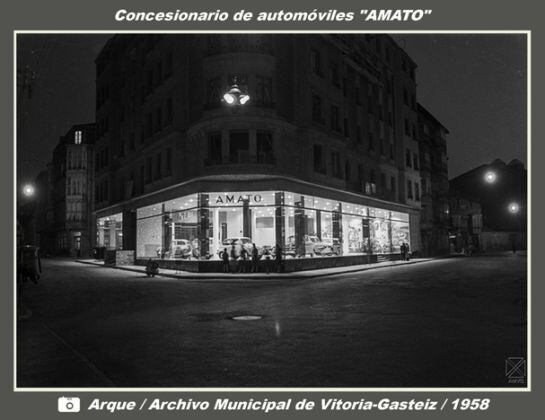 Tal como vemos en la foto que ofrecemos a continuación obtenida por Arque, en el año siguiente, 1958, en la planta baja del edifico de instaló un concesionario para la venta de coches y motocicletas, con el nombre comercial de “Amato”. Vemos entre otros vehículos el popular Seat-600 y algunas “Vespas” y “Lambrettas”.