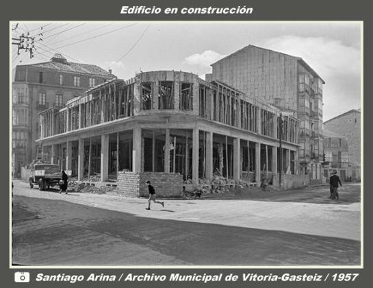 Tras el derribo de los edificios y la tapia que delimitaba el terreno con las tres calles, en el solar resultante se inició la construcción de un edificio de viviendas. El mismo fotógrafo, Santiago Arina, nos ofrece una instantánea de como discurrían las obras de la estructura de hormigón del inmueble en 1957.