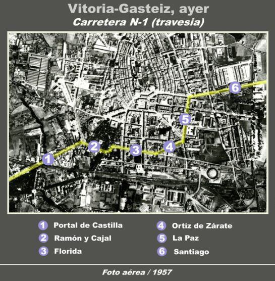 Finalmente sobre una foto aérea del año 1957 remarcamos el trayecto en aquella época de la calzada N-1, a su paso por el centro de la ciudad. El tráfico lo era en las dos direcciones.