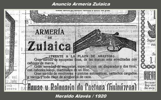 Reproducimos aquí uno de los anuncios sobre este negocio publicado en 1920 en el periódico local Heraldo Alavés, en el que se indica que aparte de escopetas de caza se vendían revólveres y pistolas automáticas.