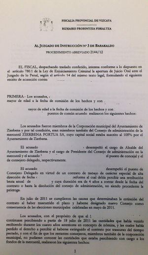 El Ministerio Público ha presentado ante el Juzgado de Instrucción nº3 de Barakaldo su escrito de acusación en el que también incluye un delito societario por el que pide 9 meses de multa. Marce Elorza es actualmente asesor de la Diputación y, según la normativa, debería ser cesado al abrirse juicio oral