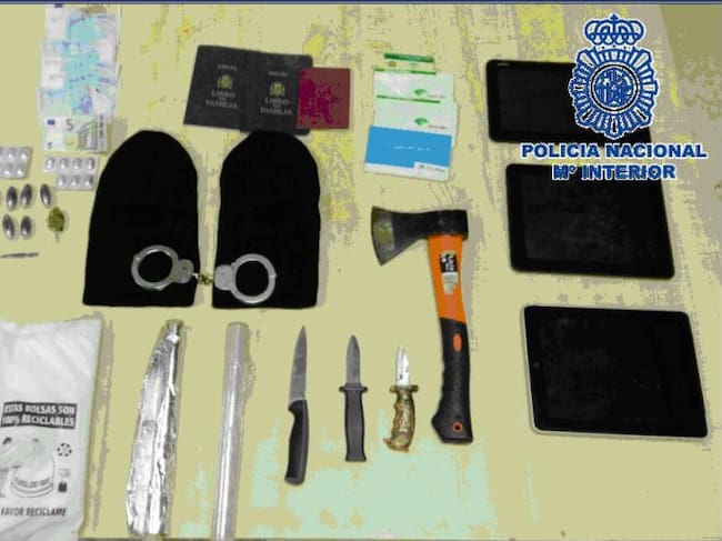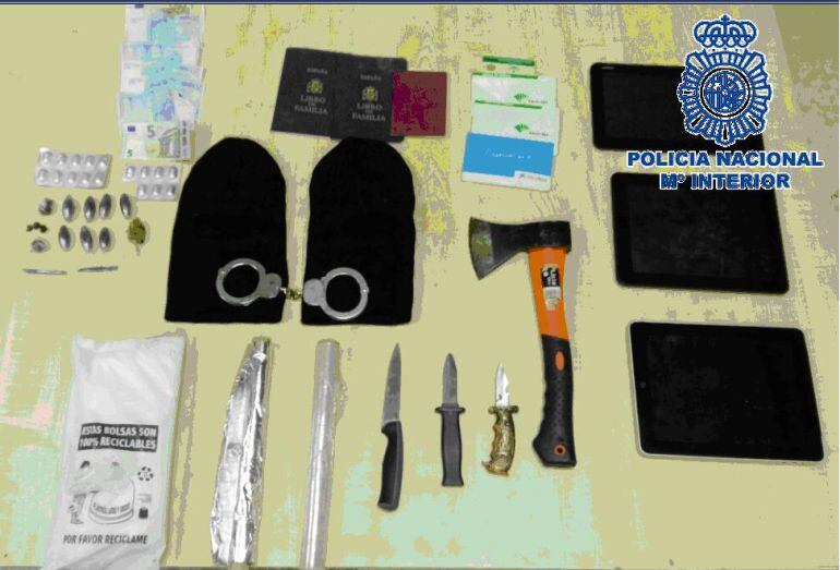 Los investigadores han practicado seis registros en viviendas pertenecientes a los miembros del grupo donde han sido incautadas diversas cantidades de hachís, cocaína y pastillas psicotrópicas, e igualmente han sido intervenidos efectos para la venta y distribución de la droga, una navaja, un hacha, un puñal, dos pasamontañas y tres tabletas electrónicas.