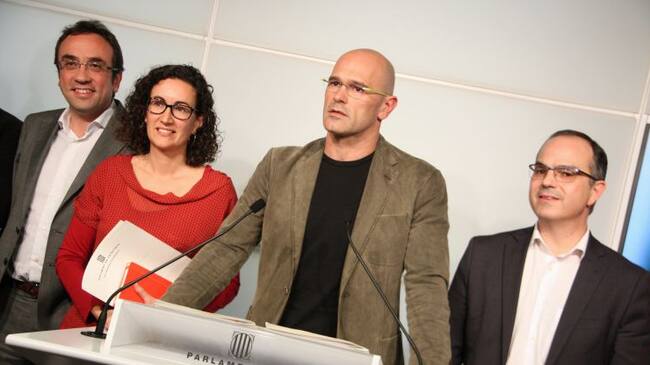 Raül Romeva, acompanyat de Marta Rovira, Josep Rull i Jordi Turull, en la roda de premsa posterior a la reunió de grup de JxSí