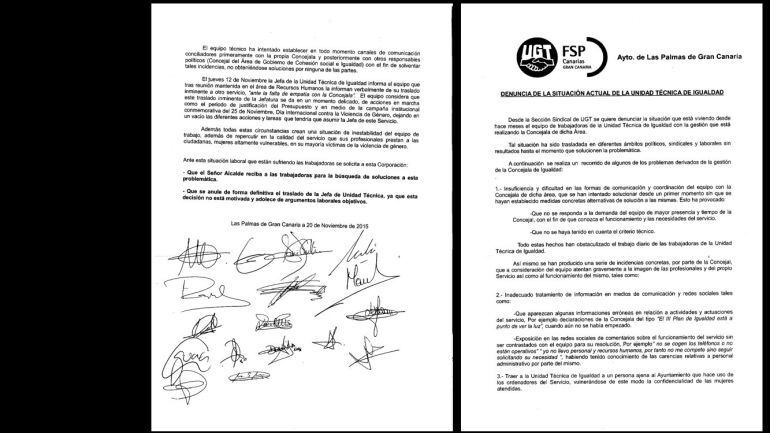 Las 17 técnicas que conforman la unidad de Igualdad del Ayuntamiento de Las Palmas se mantienen unidas y han firmado un comunicado en el que aseguran que todas las trabajadoras "desmienten las declaraciones vertidas públicamente por concejala de Igualdad, Diana Mujica, el concejal de Cohesión Social, Jacinto Ortega, y la Plataforma Independiente de Trabajadores, PIT". Igualmente, denuncian que se haya dicho que "las críticas no reflejan el sentir de todas las trabajadoras o que las acusaciones son anónima y no se atienen a la realidad". Para ello adjuntan un comunicado firmado por todas las trabajadoras en el que se relatan las irregularidades que, según ellas, habría cometido Diana Mujica (Podemos).
