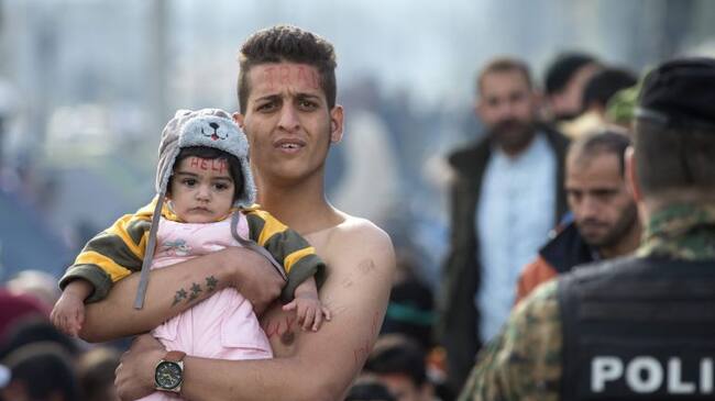 Un migrante sostiene un bebé, mientras que él y otras familias de refugiados, en su mayoría procedentes de Irán, esperan el permiso para cruzar la frontera entre Grecia y Macedonia cerca de Gevegelija (Macedonia) hoy, 24 de noviembre de 2015. Los países de la ruta de los Balcanes, Macedonia, Serbia, Croacia y Eslovenia, han comenzado a rechazar refugiados en sus fronteras, permitiendo solo el paso a refugiados de Siria, Irak o Afganistán que buscan asilo por razones políticas. Las restricciones impuestas por estos países desde el pasado 19 de noviembre no permiten entrar a su territorio a los considerados migrantes económicos, es decir, los procedentes de Irán, Bangladesh, Somalia, Marruecos y otros países de África y Asia. Estas medidas, que se han tomado para intentar reducir la ola de refugiados que busca asilo en Europa, ha provocado protestas entre los refugiados y denuncias desde organismos como ACNUR o la Organización Internacional para las Migraciones (OIM). EFE GEORGI LICOVSKI / GEORGI LICOVSKI (EFE)