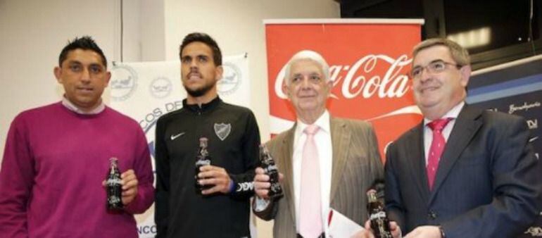 El Málaga CF, a través de su Fundación, y Coca Cola han presentado en en el estadio Ciudad de Málaga una edición especial de una botella de Coca Cola firmada por jugadores blanquiazules cuyos beneficios irán destinados al banco de alimentos.
