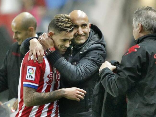 GRA266. GIJÓN, 06-12-2015.- El técnico del Sporting, Abelardo (c), se abraza con su jugador, el delantero paraguayo, Antonio Sanabria, autor de tres goles en el encuentro correspondiente a la decimocuarta jornada de primera división, que han disputado esta noche frente a Las Palmas en el estadio del Molinón, en Gijón. EFE - Alberto Morante. / Alberto Morante (EFE)