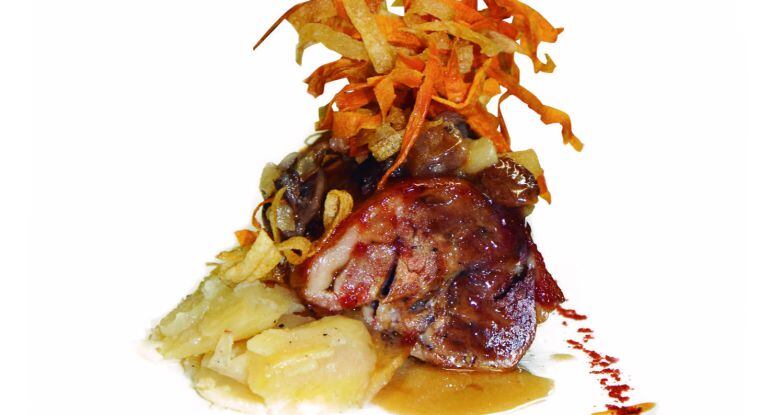 Tallem l’espatlla en 3 cilindres petits i li donem un lacat amb la sobrassada i la mel, prèviament escalfada en una olla. Ho posem durant 15 minuts al forn per a que es dauri. Per acabar, ho escalfem juntament amb les patates i la salsa i ho muntem en un plat amb les chips cruixents a sobre.