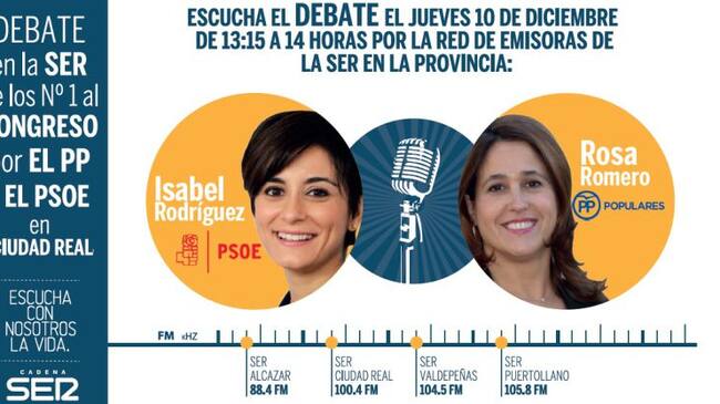 Segundo de los debates electorales organizados por Cadena SER Ciudad Real y Provincia entre las número 1 de las listas al Congreso de los Diputados; la popular Rosa Romero y la socialista Isabel Rodríguez. . Cara a Cara fijado con el mismo formato y en la misma franja horaria por la red de las emisoras de la Cadena SER en toda la provincia: Desde las 13.15 horas y hasta las 14.00, el debate se dividirá en bloques de seis minutos, donde departirán sobre Sanidad y Bienestar Social; Educación, Jóvenes; Economía y Empleo, Transparencia o Unidad de España.